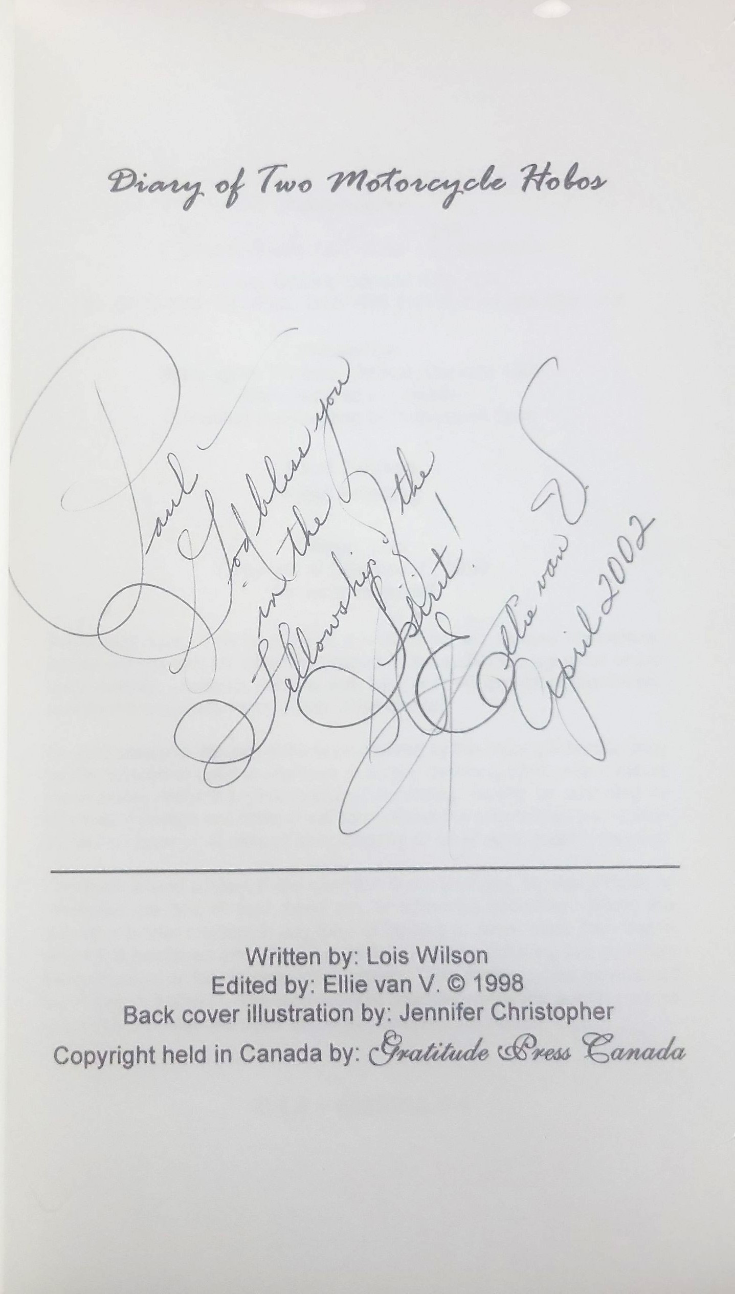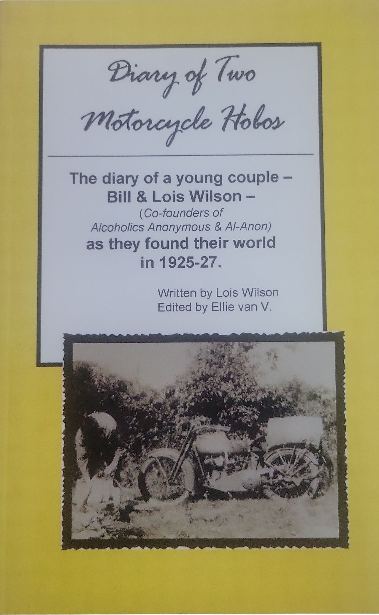 Rare book of Lois and Bill Wilson. Quite entertaining! Brand new! A VERY RARE OUT OF PRINT, FIRST EDITION FIRST PRINTING, each is individually numbered inside the front cover. This is the 393rd copy made. Under 10K made. Gratitude Press Canada in Ottawa, Ontario, Canada. Written by Lois Wilson and Edited by Ellie van V. The original typed manuscript is 131 pages, 8 1/2″ x 11″. This paperback book is 137 pages. 0968356001. Bill Wilson is the Co-founder of Alcoholics Anonymous and Lois the Co-founder of Al-Anon. I am sure everyone in A.A. and Al-Anon community- and indeed all who are interested in these Programs’ history will enjoy this enchanting story. You are invited to follow Bill W., and his wife Lois, on their Harley Davidson motorcycle adventures in Eastern America in the late 1920’s. Come and recreate a crucial part of their life journey together!