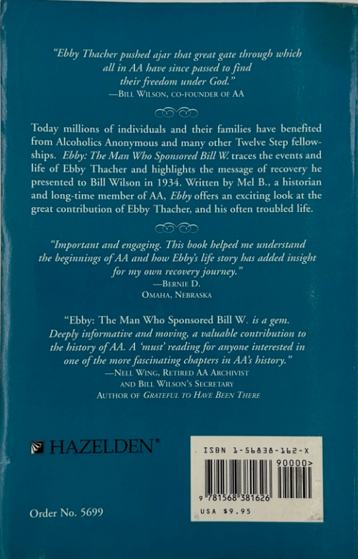 Today millions of individuals and their families have benefited from Alcoholics Anonymous and many other Twelve Step fellow-ships. Ebby: The Man Who Sponsored Bill W. traces the events and life of Ebby Thacher and highlights the message of recovery he presented to Bill Wilson in 1934. Written by Mel B., a historian and long-time member of AA, Ebby offers an exciting look at the great contribution of Ebby Thacher, and his often troubled life.